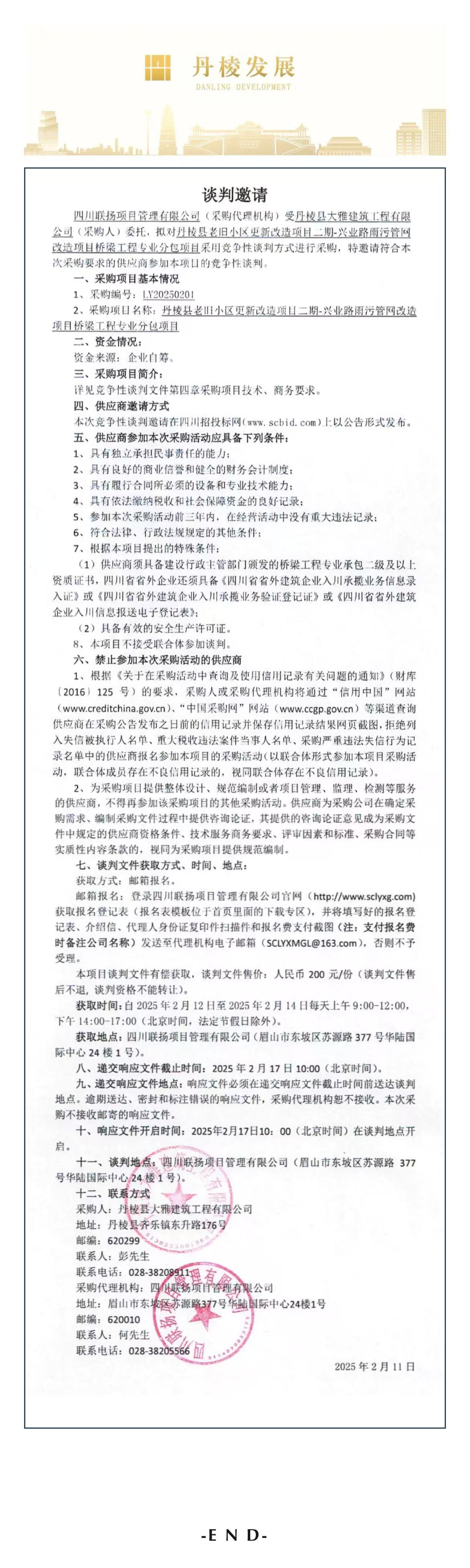 丹棱縣老舊小區(qū)更新改造項(xiàng)目二期-興業(yè)路雨污管網(wǎng)改造項(xiàng)目橋梁工程專業(yè)分包項(xiàng)目談判邀請公告