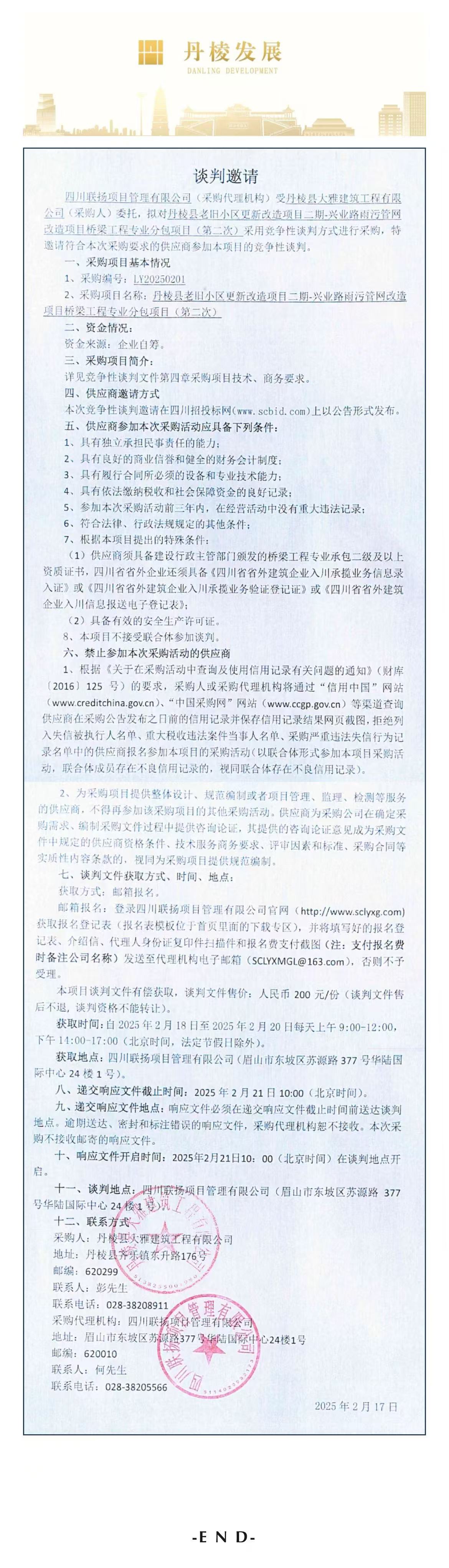 丹棱縣老舊小區(qū)更新改造項目二期-興業(yè)路雨污管網(wǎng)改造項目橋梁工程專業(yè)分包項目談判邀請公告(第二次)