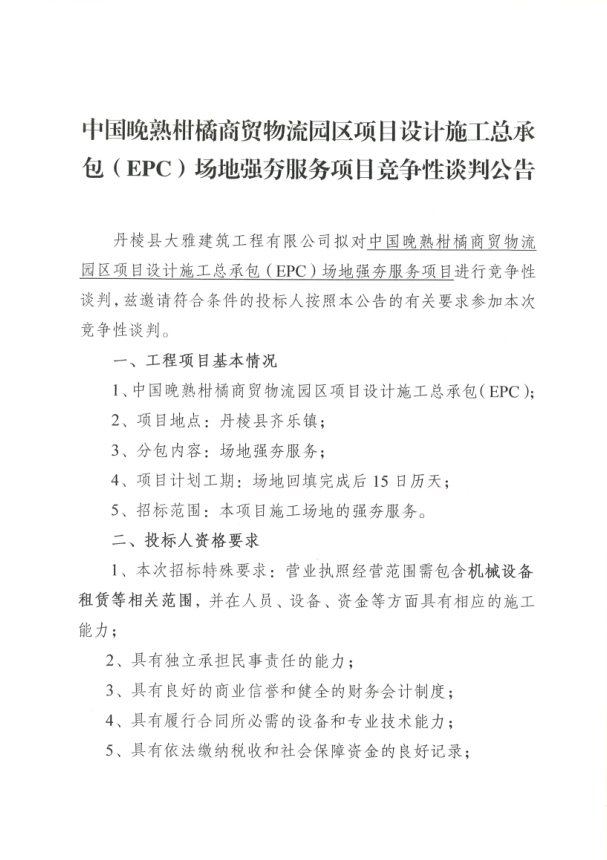 【大雅建筑公司】中國(guó)晚熟柑橘商貿(mào)物流園區(qū)項(xiàng)目設(shè)計(jì)施工總承包(EPC)場(chǎng)地強(qiáng)夯服務(wù)項(xiàng)目競(jìng)爭(zhēng)性談判公告