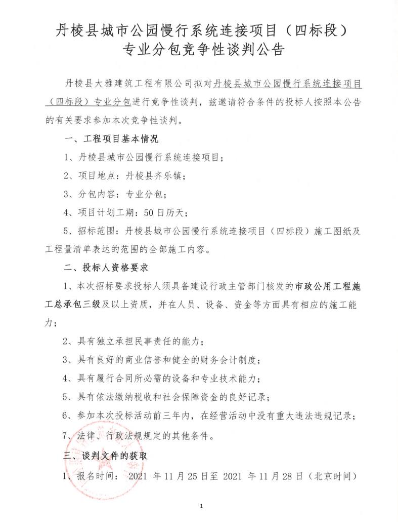 【大雅建筑公司】丹棱縣城市公園慢性系統(tǒng)連接項(xiàng)目(四標(biāo)段)專業(yè)分包競(jìng)爭(zhēng)性談判公告