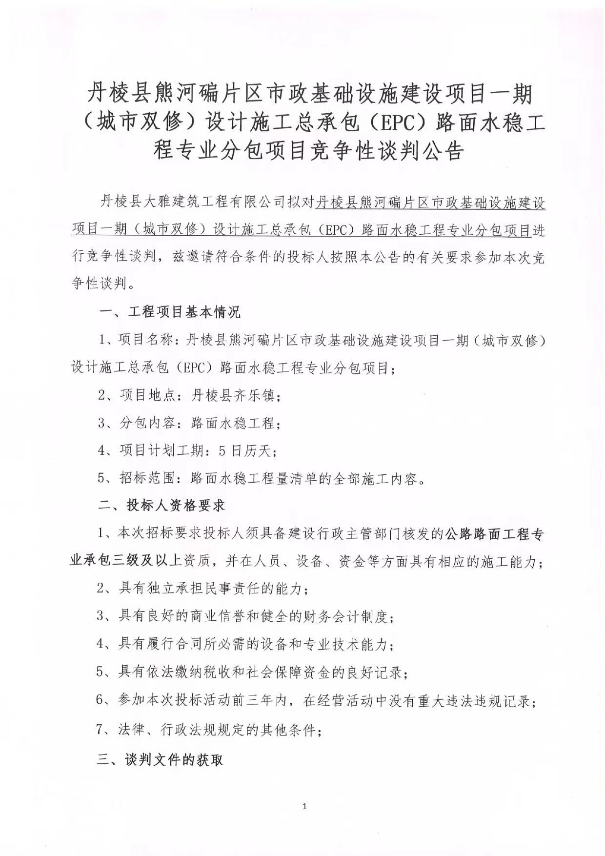 丹棱縣熊河碥片區(qū)市政基礎(chǔ)設(shè)施建設(shè)項目一期(城市雙修)設(shè)計施工總承包(EPC)路面水穩(wěn)工 程專業(yè)分包項目競爭性談判公告