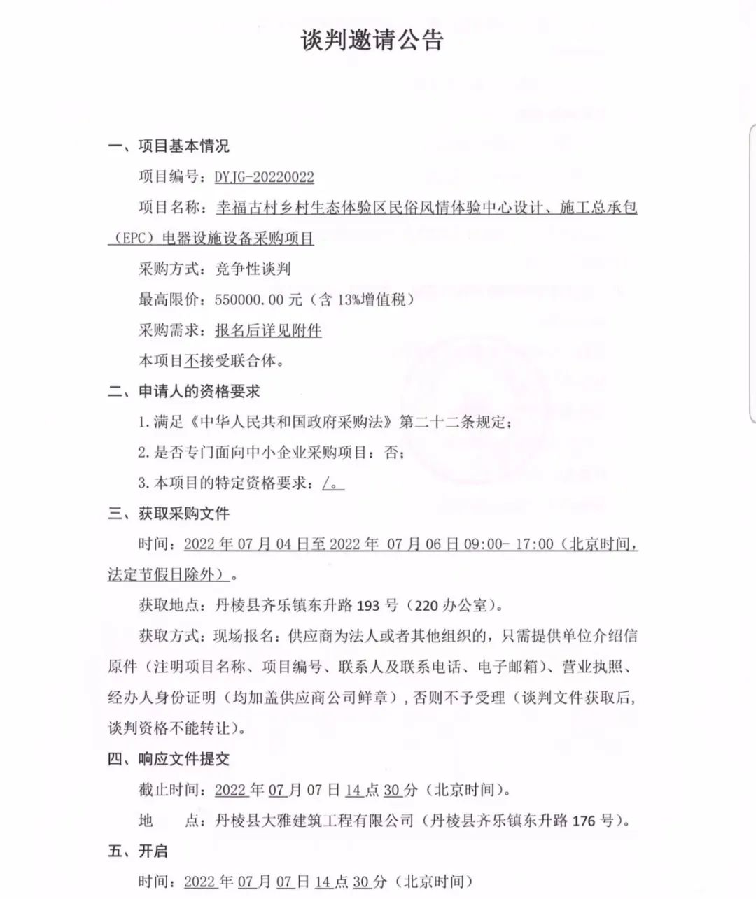 幸福古村鄉(xiāng)村生態(tài)體驗區(qū)民俗風情體驗中心設(shè)計、施工總承包(EPC)電器設(shè)施設(shè)備采購項目談判邀請公告