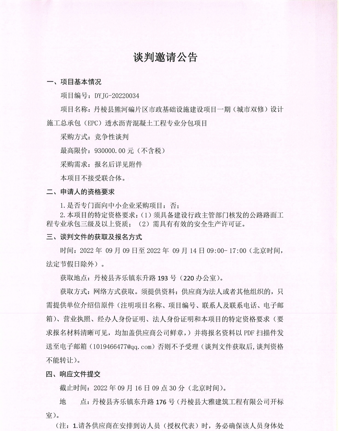 丹棱縣熊河碥片區(qū)市政基礎設施建設項目一期(城市雙修)設計施工總承包(EPC)透水瀝青混凝土工程專業(yè)分包項目談判邀請公告