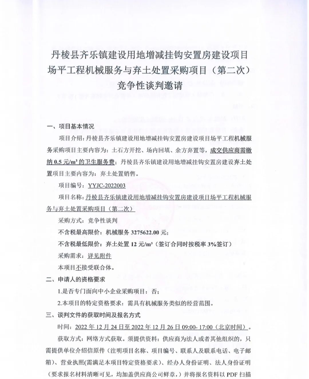 丹棱縣齊樂鎮(zhèn)建設用地增減掛鉤安置房建設項目場平工程機械服務與棄土處置采購項目(第二次)競爭性談判邀請