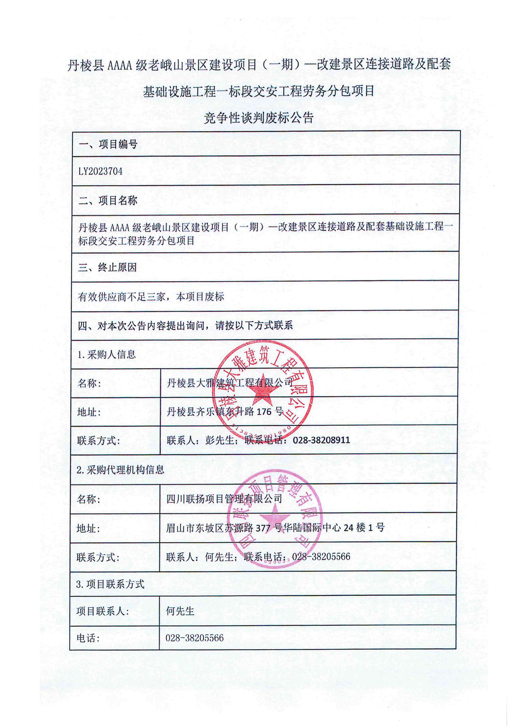 丹棱縣AAAA級老峨山景區(qū)建設(shè)項目(一期)一改建景區(qū)連接道路及配套基礎(chǔ)設(shè)施工程一標段交安工程勞務(wù)分包項目競爭性談判廢標公告