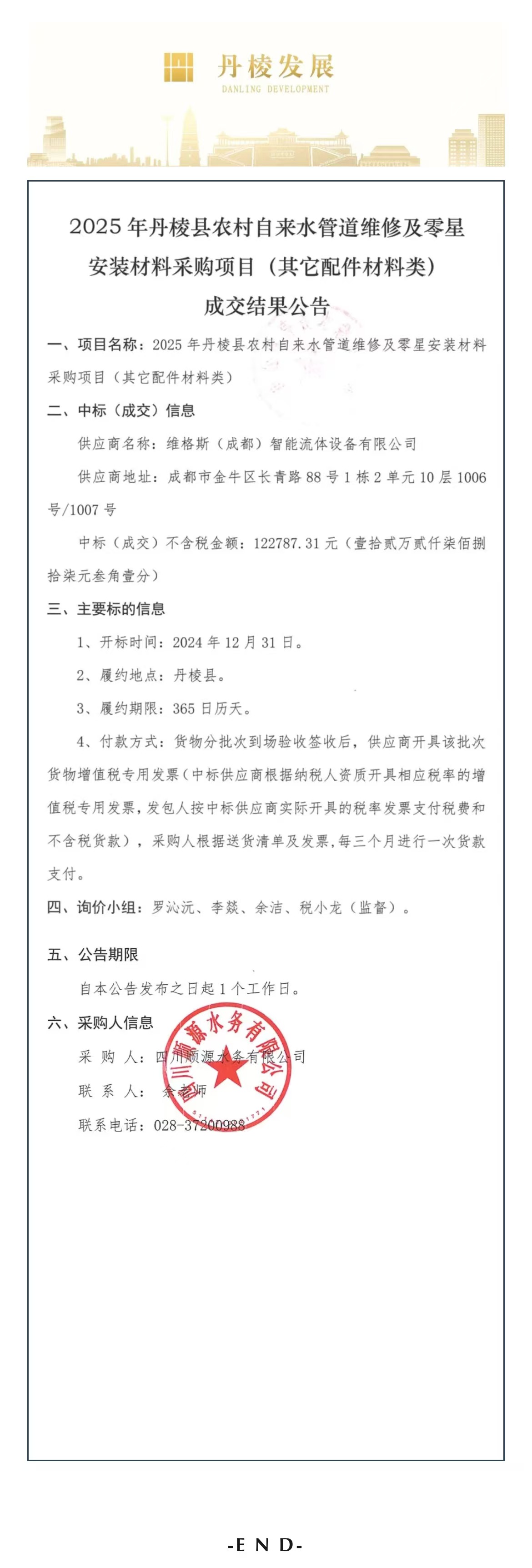 2025年丹棱縣農(nóng)村自來(lái)水管道維修及零星安裝材料采購(gòu)項(xiàng)目(其他配件材料類(lèi))成交結(jié)果公告