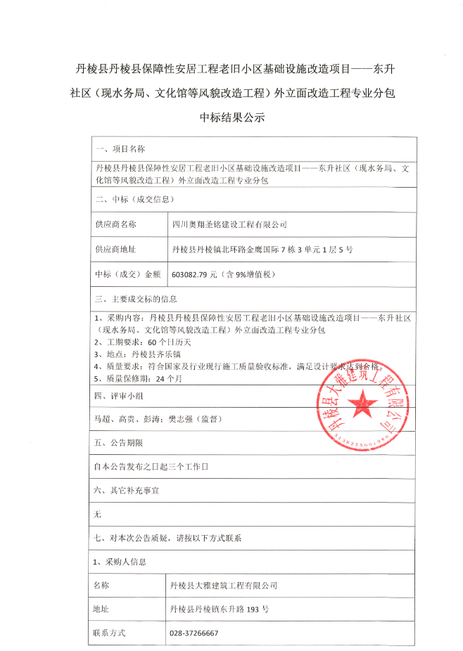 【大雅建筑公司】丹棱縣保障性安居工程老舊小區(qū)基礎設施改造項目--東升社區(qū)(現水務局、文化館等風貌改造工程)外立面改造工程專業(yè)分包中標結果公示