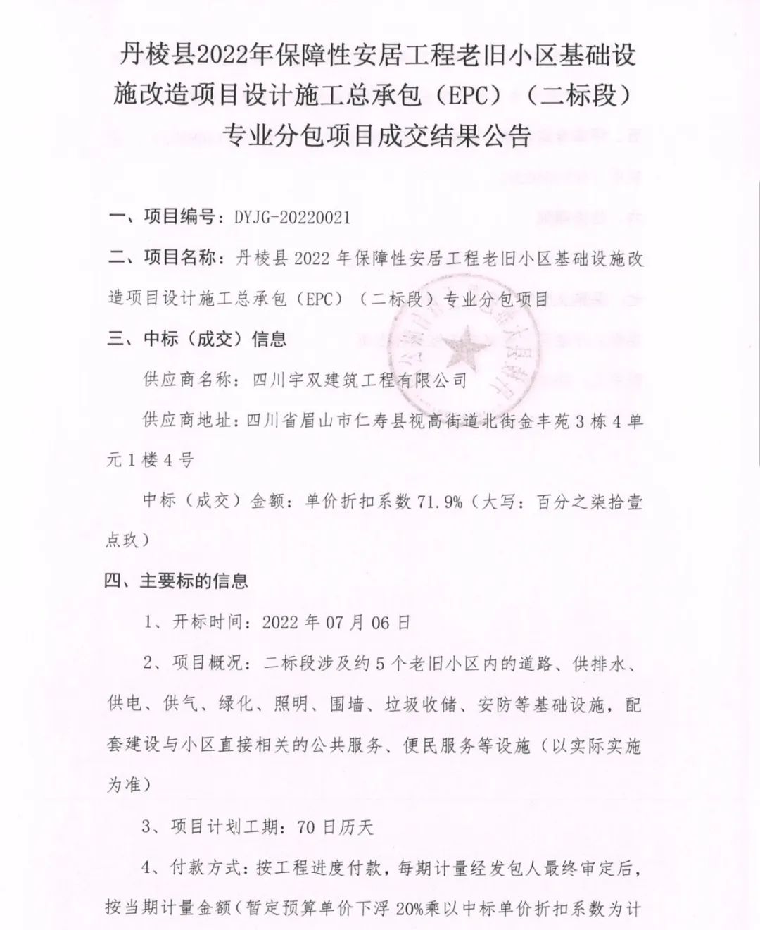 丹棱縣2022年保障性安居工程老舊小區(qū)基礎(chǔ)設(shè)施改造項(xiàng)目設(shè)計施工總承包(EPC)(二標(biāo)段)專業(yè)分包項(xiàng)目成交結(jié)果公告