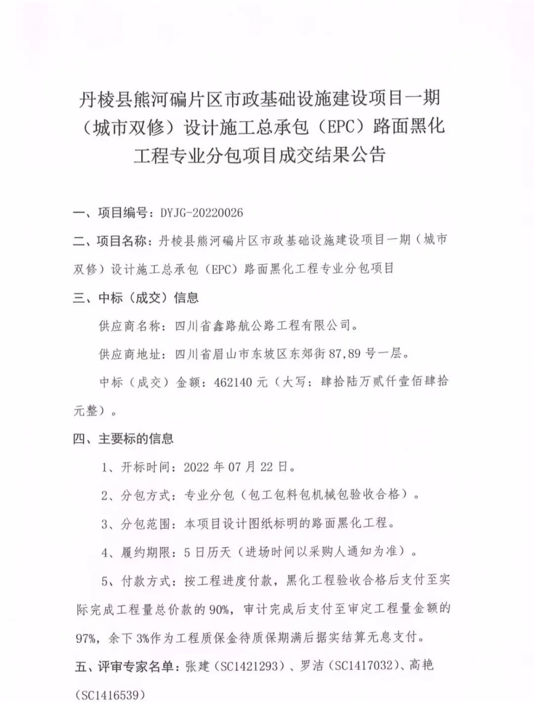 丹棱縣熊河碥片區(qū)市政基礎(chǔ)設(shè)施建設(shè)項(xiàng)目一期(城市雙修)設(shè)計(jì)施工總承包(EPC)路面黑化工程專業(yè)分包項(xiàng)目成交結(jié)果公告