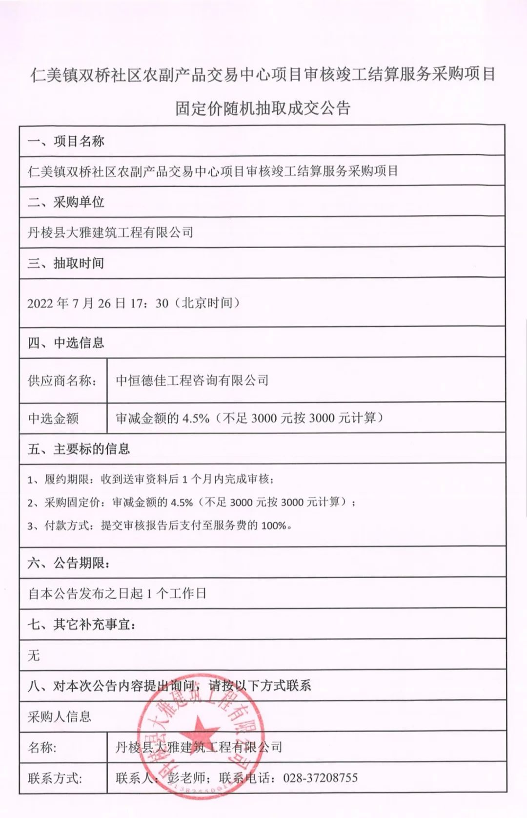 仁美鎮(zhèn)雙橋社區(qū)農(nóng)副產(chǎn)品交易中心項(xiàng)目審核竣工結(jié)算服務(wù)采購(gòu)項(xiàng)目固定價(jià)隨機(jī)抽取成交公告