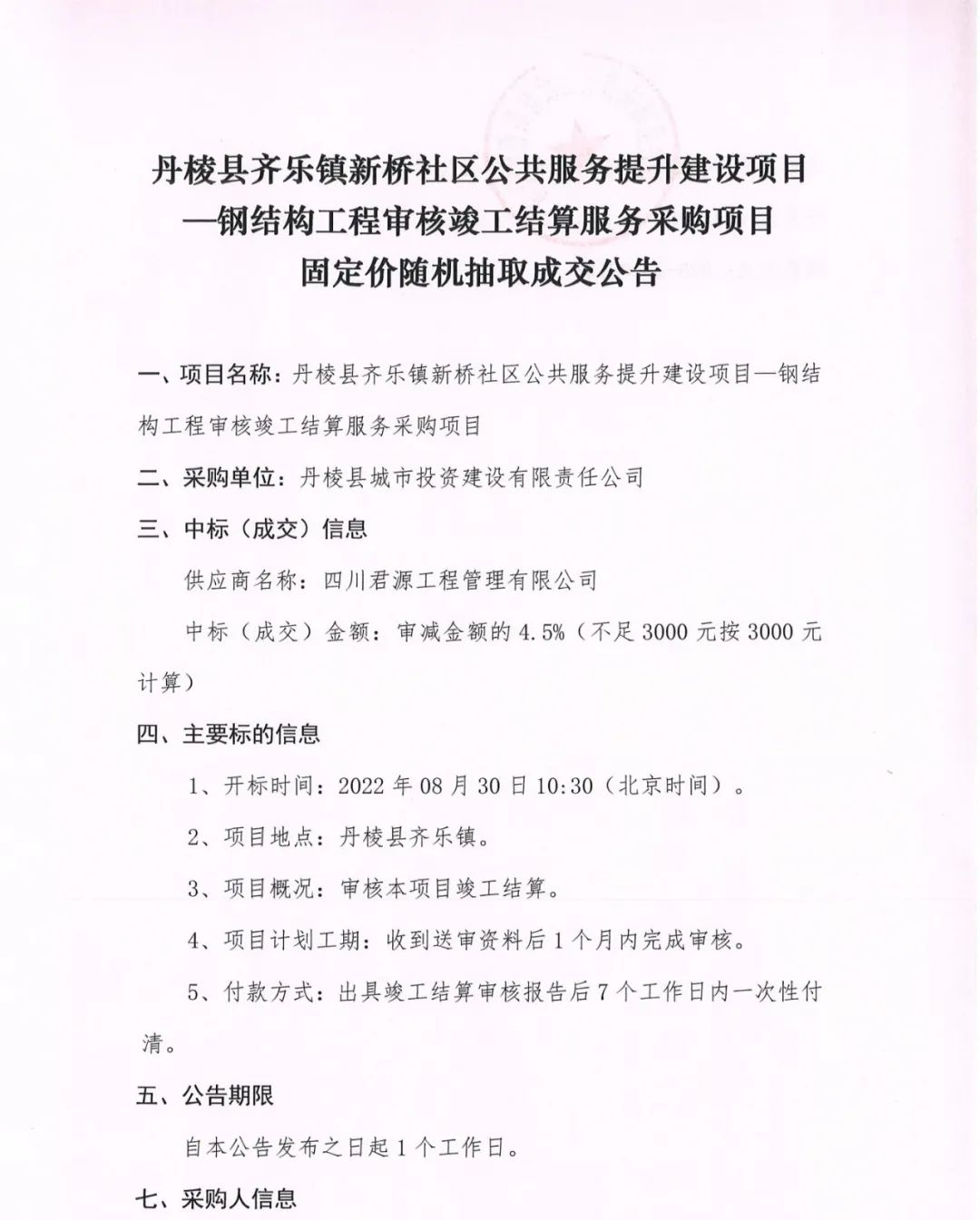 丹棱縣齊樂鎮(zhèn)新橋社區(qū)公共服務提升建設(shè)項目--鋼結(jié)構(gòu)工程審核竣工結(jié)算服務采購項目固定價隨機抽取成交公告