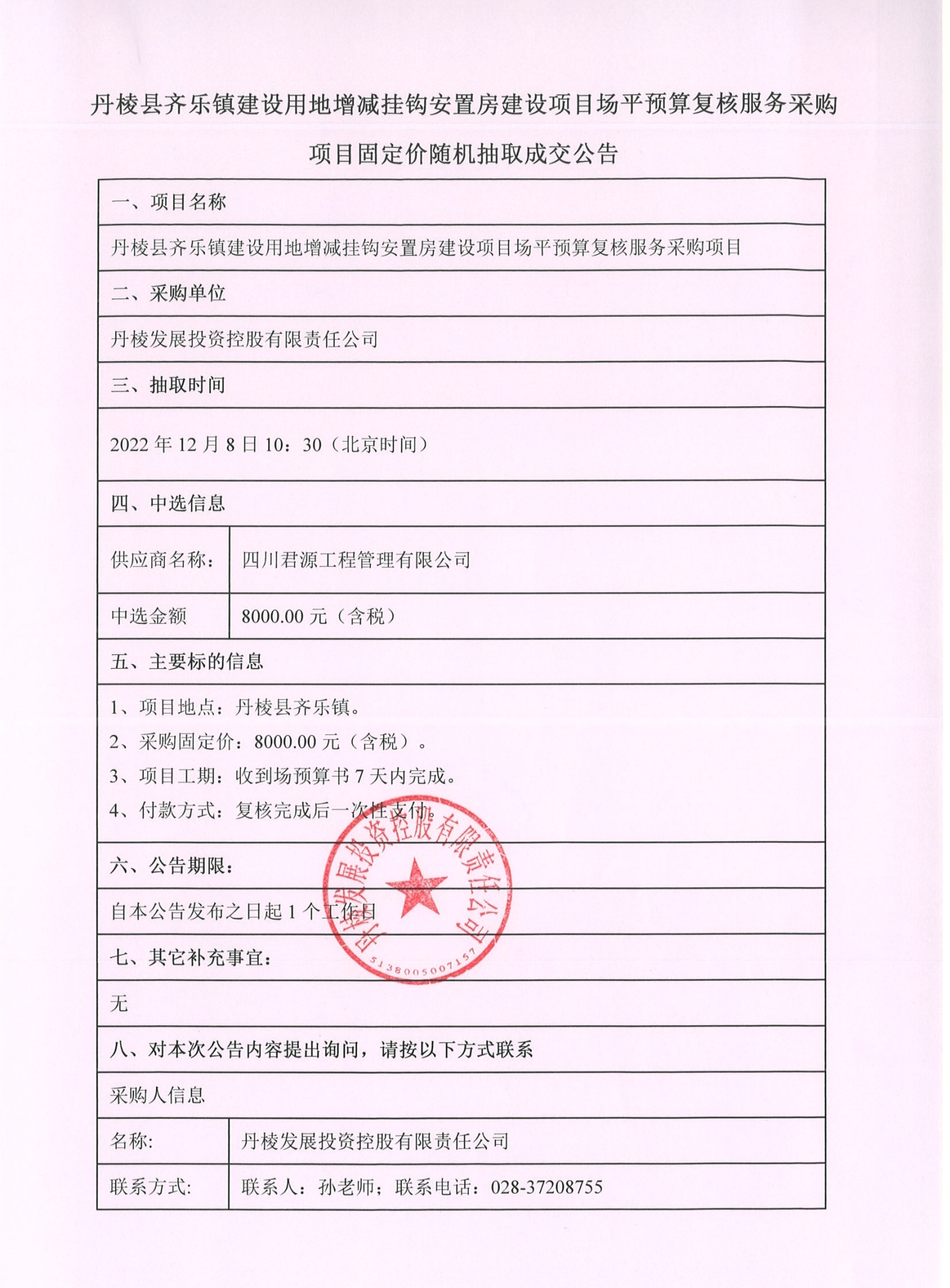 丹棱縣齊樂鎮(zhèn)建設(shè)用地增減掛鉤安置房建設(shè)項目場平預算復核服務采購項目固定價隨機抽取成交公告