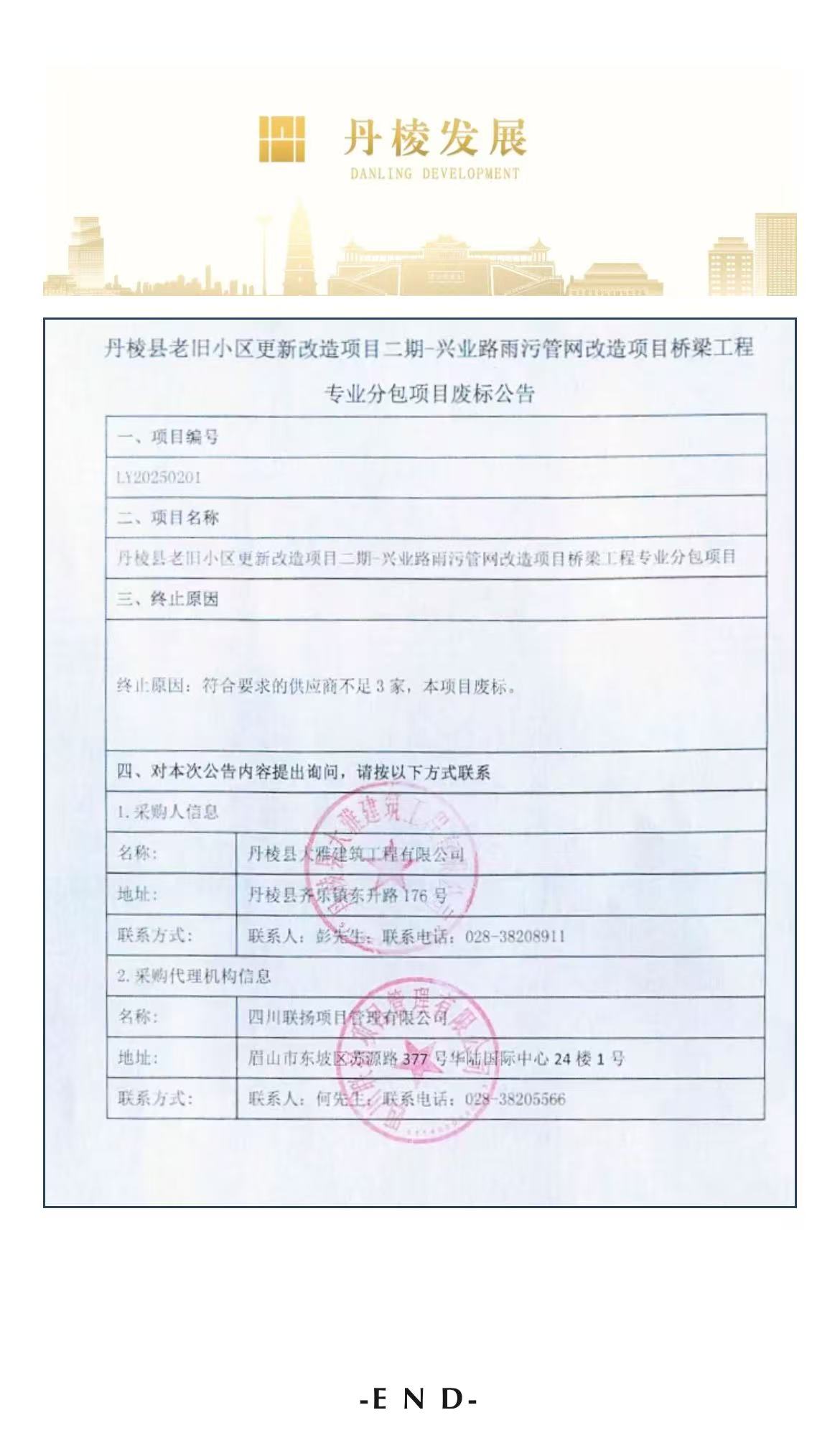 丹棱縣老舊小區(qū)更新改造項目二期-興業(yè)路雨污管網(wǎng)改造項目橋梁工程專業(yè)分包項目廢標(biāo)公告