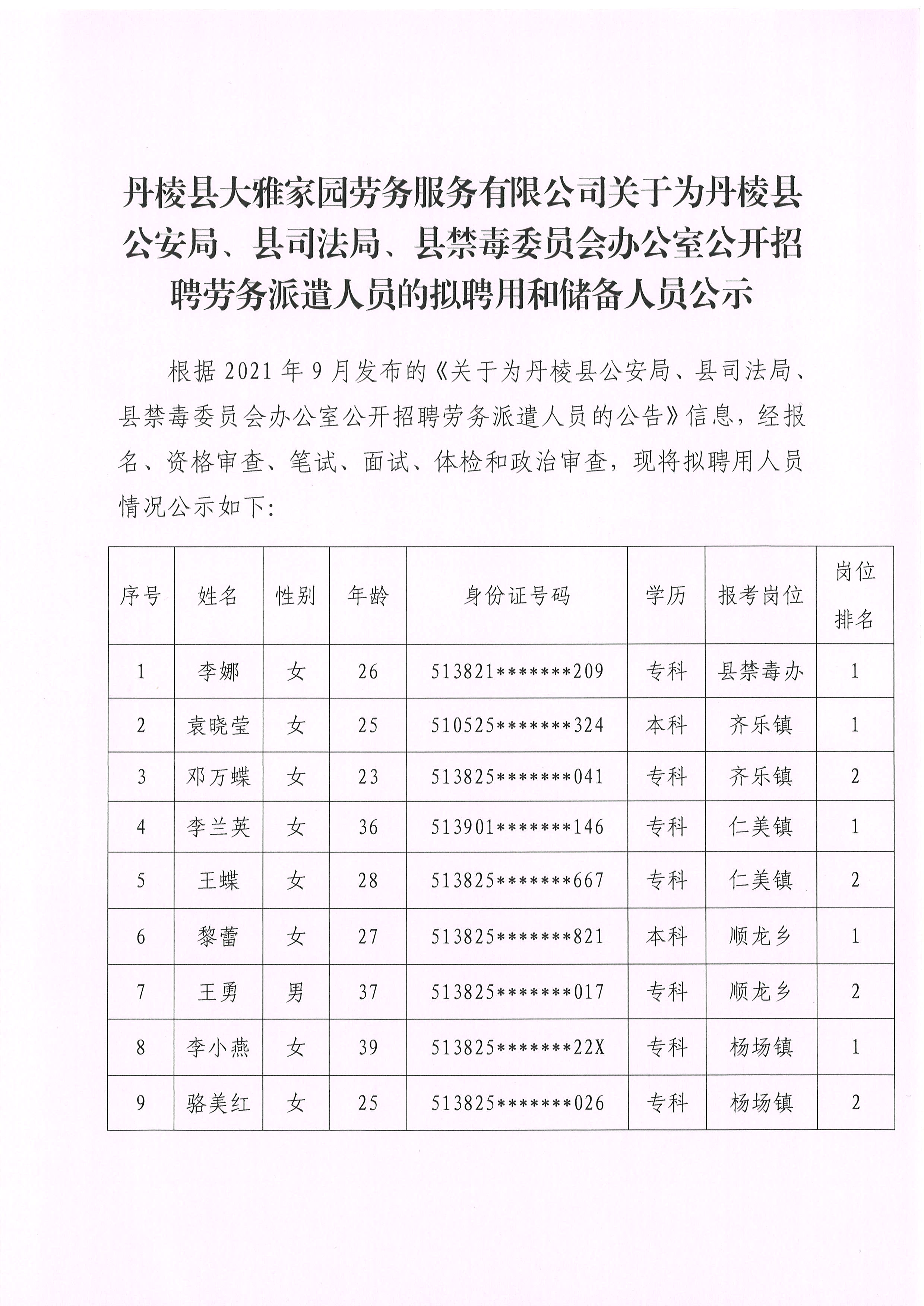 【大雅勞務公司】丹棱縣大雅家園勞務服務有限公司關于為丹棱縣公安局、縣司法局、縣禁毒委員會辦公室公開招聘勞務派遣人員的擬聘用和儲備人員公示