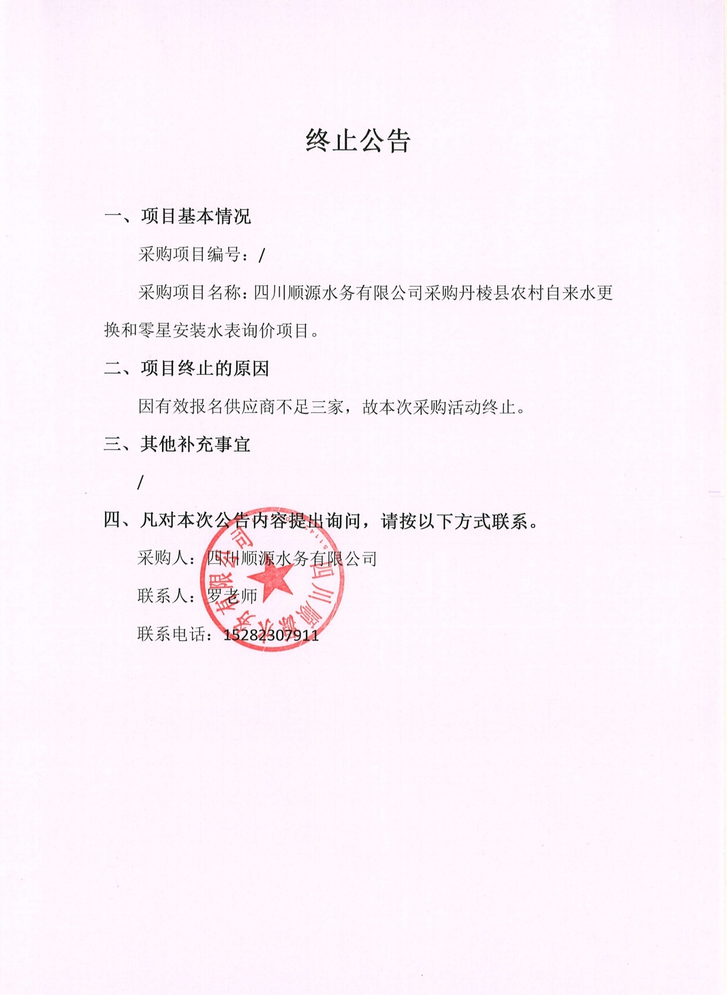 四川順源水務(wù)有限公司采購(gòu)丹棱縣農(nóng)村自來(lái)水更換和零星安裝水表詢價(jià)項(xiàng)目終止公告