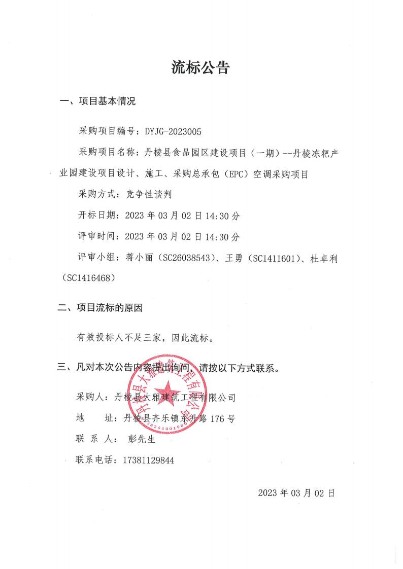 丹棱縣食品園區(qū)建設(shè)項(xiàng)目(一期)--丹棱凍粑產(chǎn)業(yè)園建設(shè)項(xiàng)目設(shè)計(jì)、施工、采購(gòu)總承包(EPC)空調(diào)采購(gòu)項(xiàng)目流標(biāo)公告