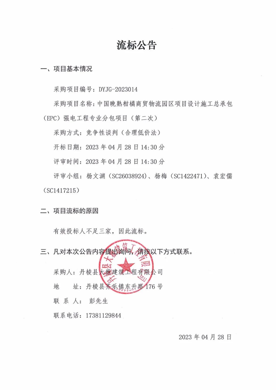 中國晚熟柑橘商貿(mào)物流園區(qū)項目設(shè)計施工總承包(EPC)強(qiáng)電工程專業(yè)分包項目(第二次)流標(biāo)公告