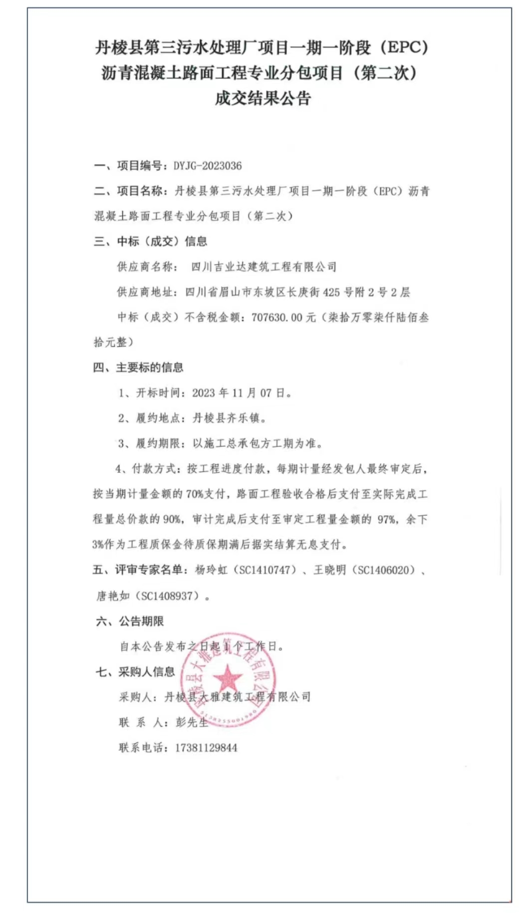 丹棱縣第三污水處理廠項目一期一階段(EPC)瀝青混凝土路面工程專業(yè)分包項目(第二次)成交結(jié)果公告