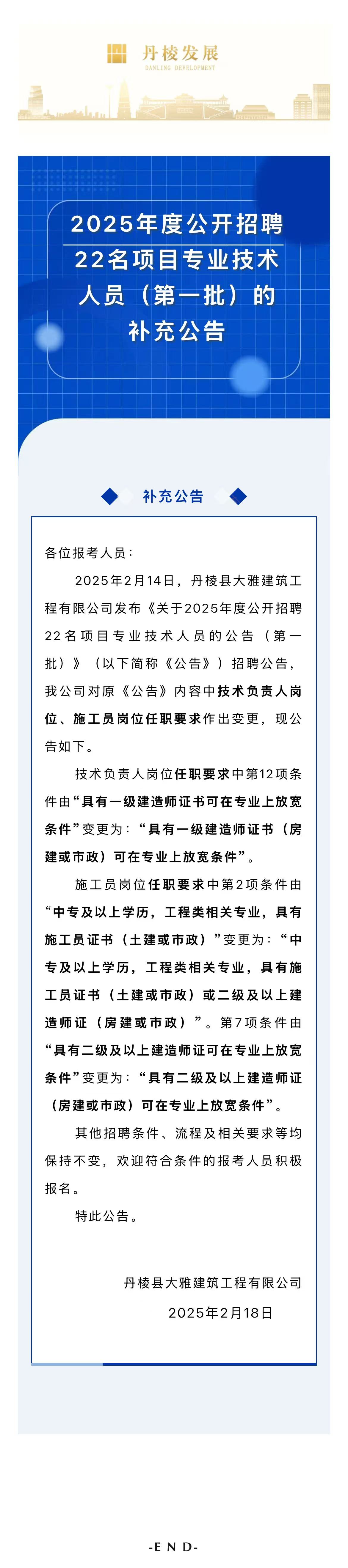 丹棱縣大雅建筑工程有限公司關(guān)于2025年度公開招聘22名項目專業(yè)技術(shù)人員(第一批)的補充公告