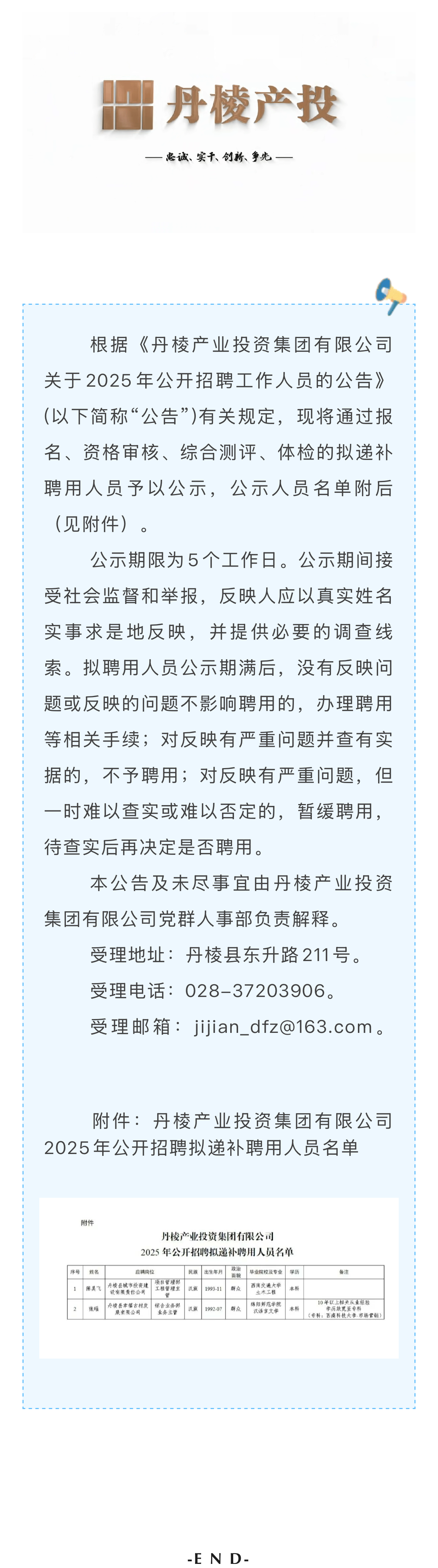 丹棱產(chǎn)業(yè)投資集團(tuán)有限公司關(guān)于2025年公開招聘擬遞補(bǔ)聘用人員的公示